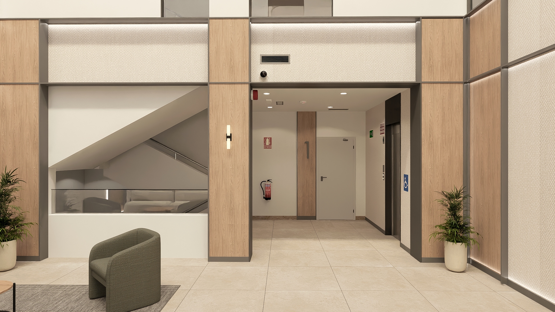 El proyecto incluye la renovación casi completa de acabados y materiales de revestimiento, una mejora de la iluminación global, así como una reestructuración de los huecos de fachada interior, que hace que el edificio consiga una imagen más actual y representativa. El nuevo concepto de diseño apuesta por una estética boutique, incorporando materiales de alta calidad, iluminación cuidada y detalles que refuerzan la identidad del edificio ofreciendo un espacio más atractivo, funcional y confortable para los usuarios y mejorando la percepción global del edificio y su valor en el mercado.