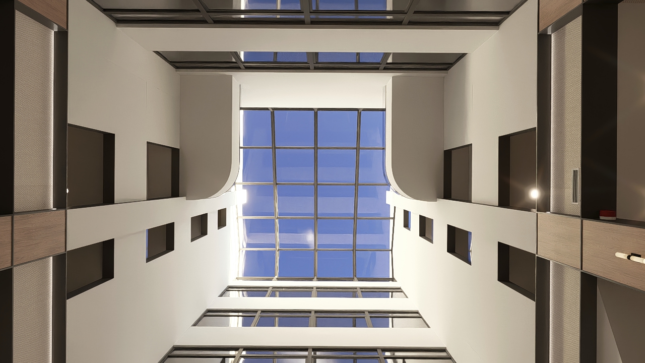 El nuevo diseño de los espacios de uso común realza los valores arquitectónicos preexistentes en el edificio, que cuenta con un gran atrio central, cerrado por un lucernario que aporta luz natural a todas las plantas. Los dos núcleos de escaleras que se abren al atrio se integran en la propuesta como elementos de conexión y visibilidad entre los distintos niveles.